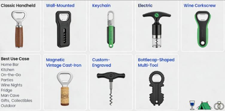 Each style serves a unique purpose, proving that bottle openers are far more than just “cap poppers” – they’re tailored to every lifestyle and occasion.