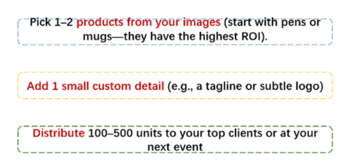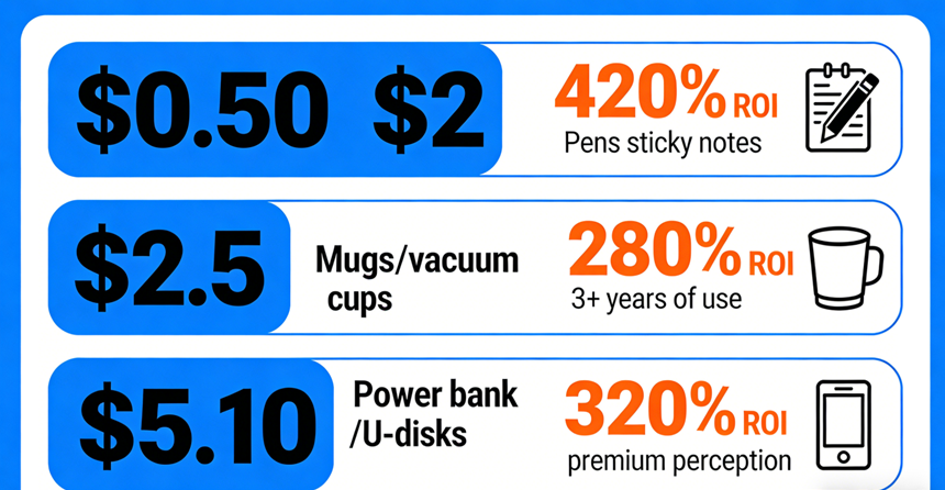 A startup with a $300 budget could get 600 pens (420% ROI = $1,260 in brand value) or 30 power banks (320% ROI = $960). The cheapest option isn’t always the worst—it’s the most useful that wins.