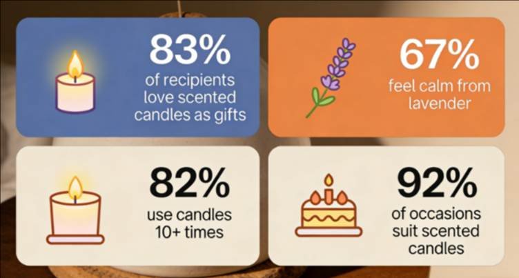 - Anniversaries: Romantic scents (rose, jasmine, vanilla) set the mood – 65% of couples say scented candles add intimacy to their celebration.
