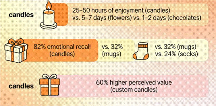 - Affordability: High-quality scented candles range from 15–45, making them accessible for every budget. Customized options add just 5–10, but increase the perceived value by 60% (recipients estimate custom candles are 2x more expensive than they actually are).