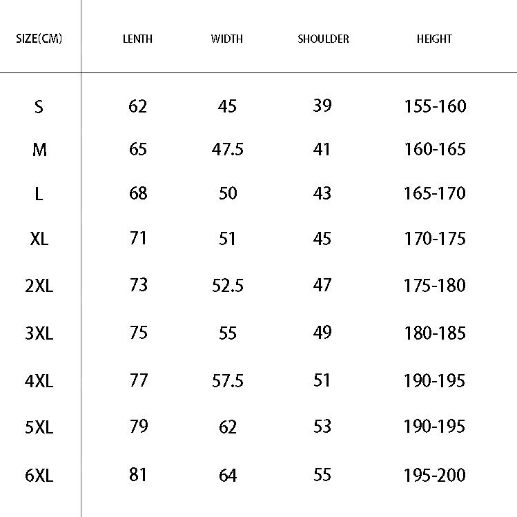 S, M, L, XL, 2XL, 3XL, 4XL, 5XL, 6XL
